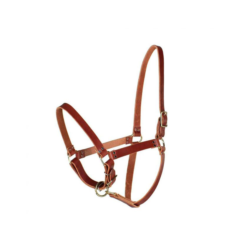 - Smooth and refined leather halter is 1 inch wide with stained edges.